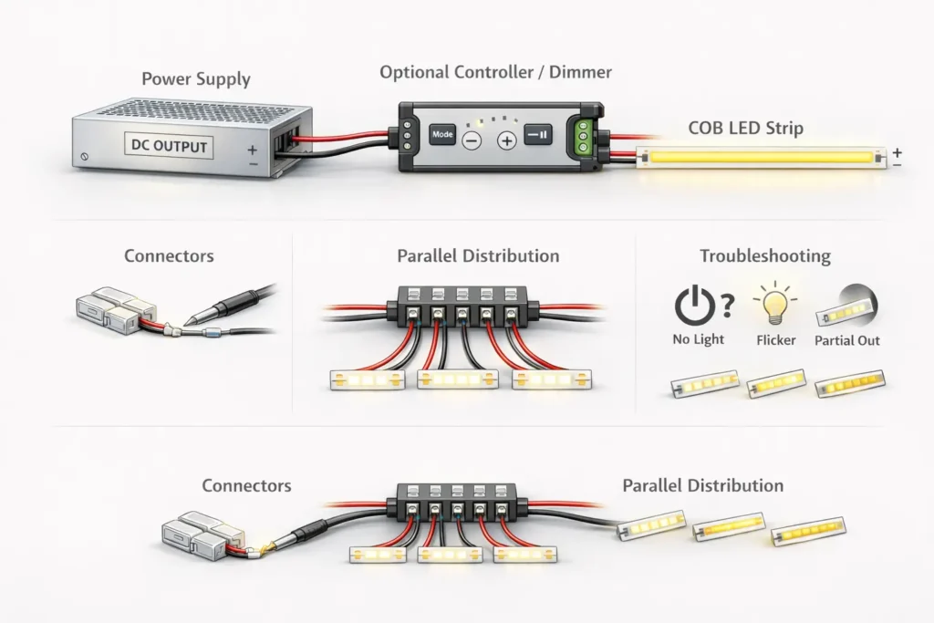Contents Quick Answer: How to Connect a COB LED Strip Before You Connect: Identify Strip Type, Voltage, and Connection Method Wiring Order: Power Supply → (Controller/Dimmer) […]