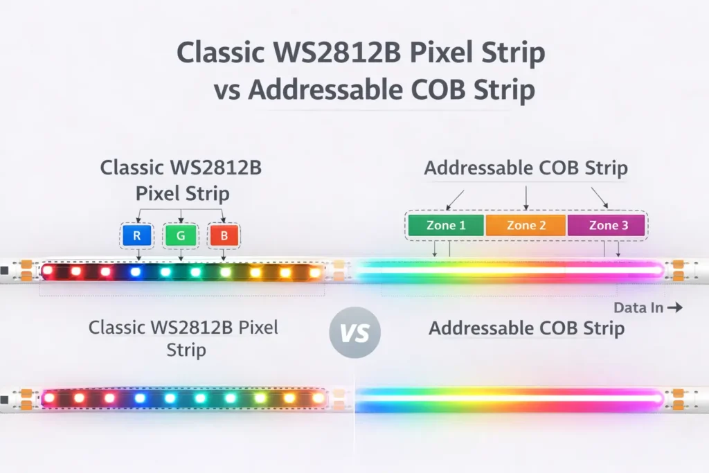 Addressable COB vs classic WS2812B pixel strip (quick comparison):